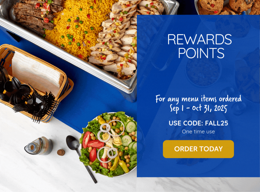 A light Mediterranean chicken, fire roasted and seasoned with flavors of fresh lemon and capers. Served with white confetti rice, Caesar salad, assorted rolls with butter, and basket filled with cookies & brownies.